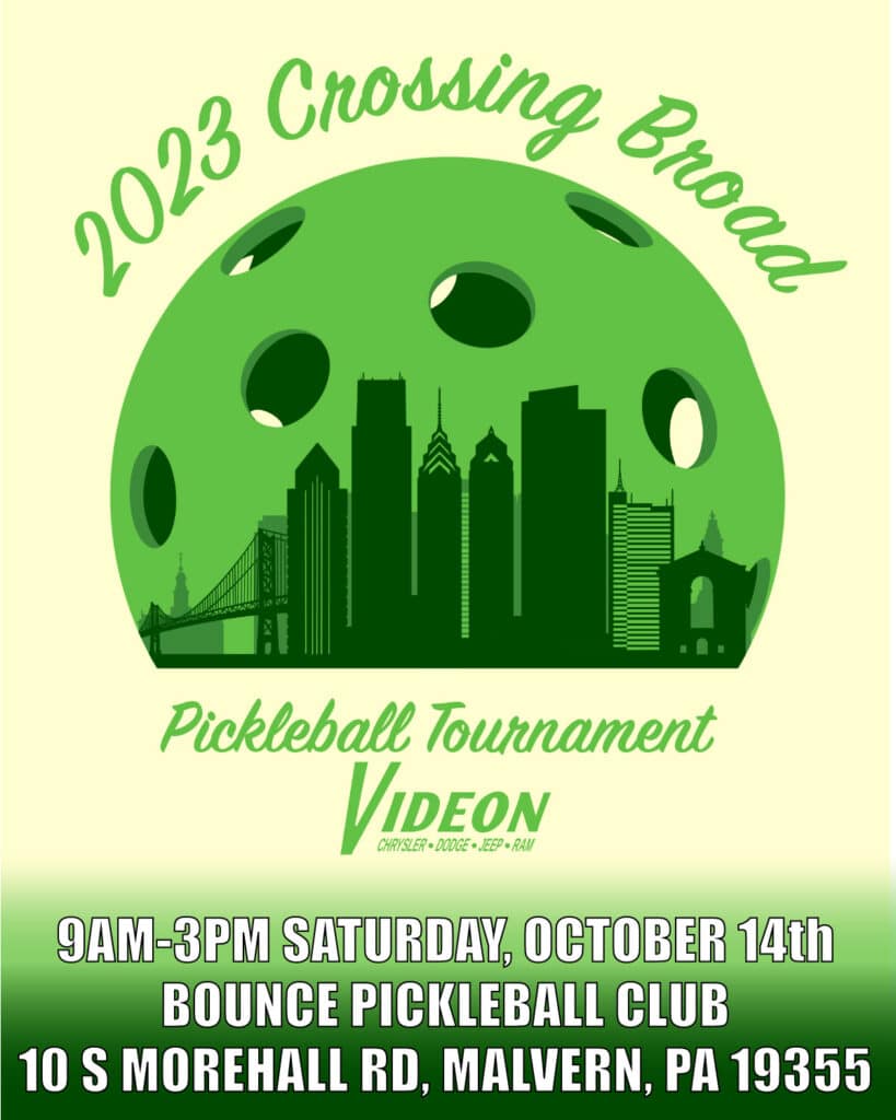 Introducing the Crossing Broad Pickleball Tournament* presented by Videon – Chrysler, Dodge, Jeep, and Ram! It will be held on October 14th from 9 a.m. – 3 p.m. at the state-of-the-art Bounce Pickleball Club in Malvern. Only 32 team slots are available, so grab them before they sell out (you only need one ticket per team). Fastest growing sport in the world, baby!