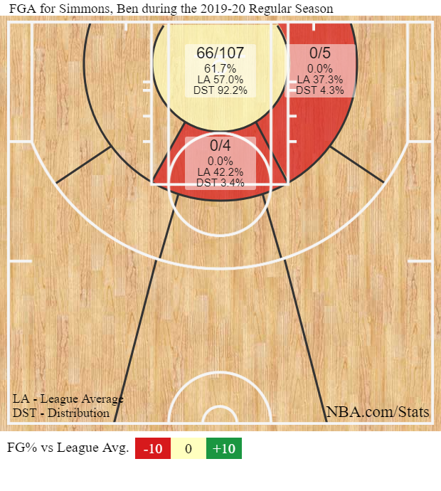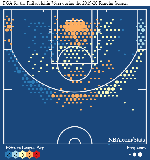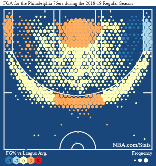 Check out the Sixers’ team shot chart in hex format. Blue is cold, below league average, while red is hot, above league average: