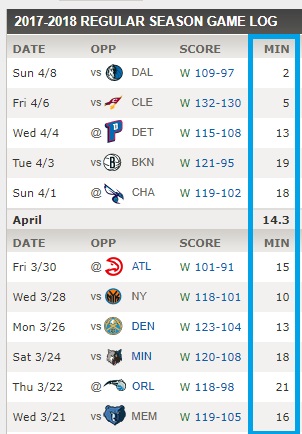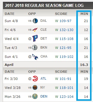 T.J.’s minutes have steadily declined in 2018, from 25.1 in January, to 24.2 in February and 18.8 in March. He’s played 14.3 per game in April, as you can see above.