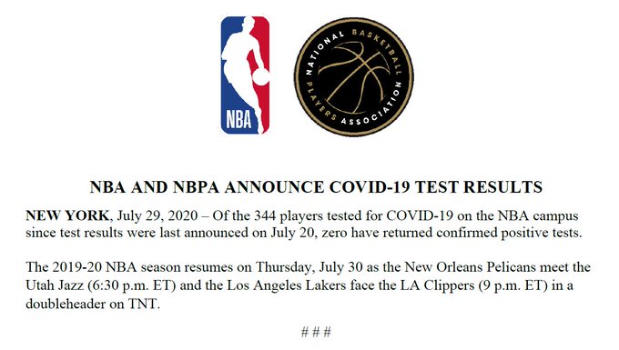 Today the NBA announced that there are a grand total of zero COVID cases down at Disney: