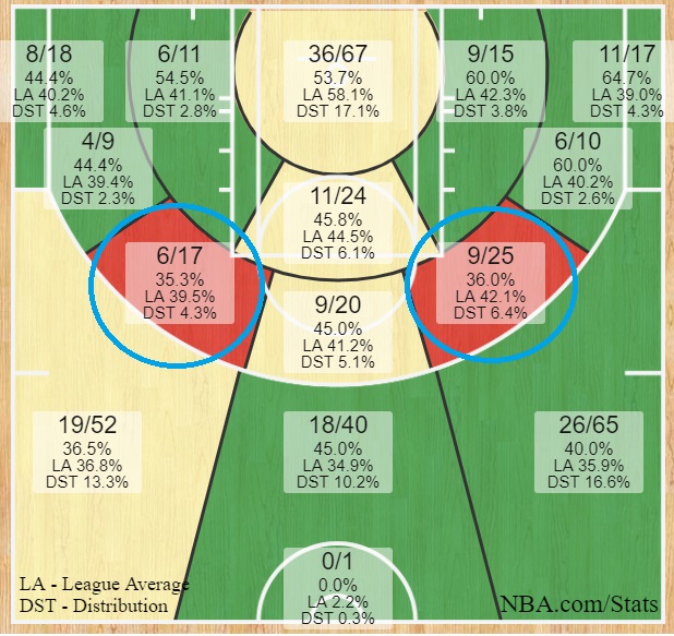 Not only does he take too many shots from those areas, but he’s well below league average.