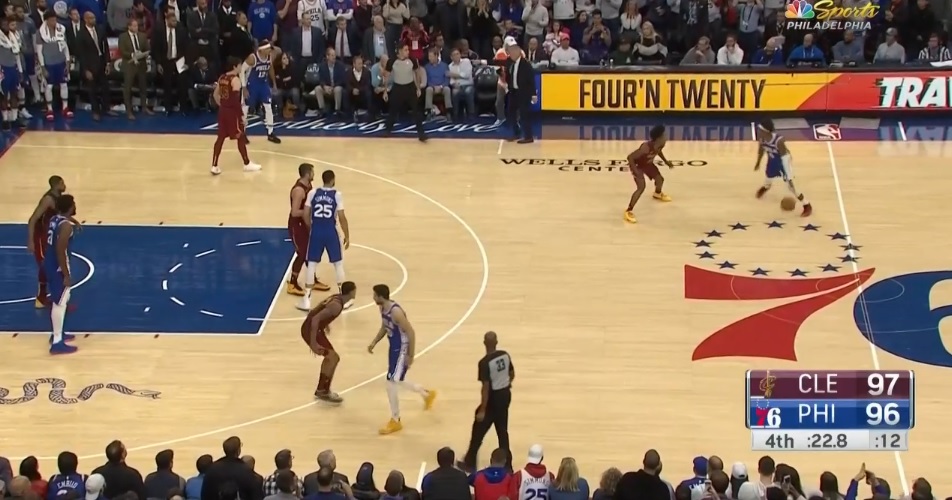 It’s basically the same play that killed the Sixers at the end of that Jazz game. In this case, Kevin Love does the same thing, but that’s a pretty good recovery from Simmons to get out there and make Love reset himself. James Ennis comes flying across late to try to get a hand on the shot.