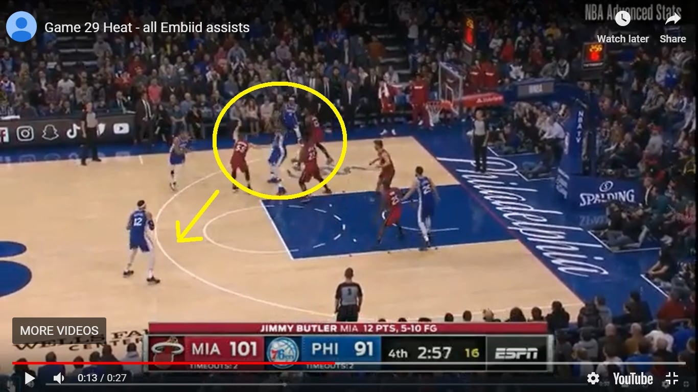 On the second one, Embiid almost fumbles the pass, but gathers in a crowd and then whips the ball to Harris, same inside-to-outside concept as before: