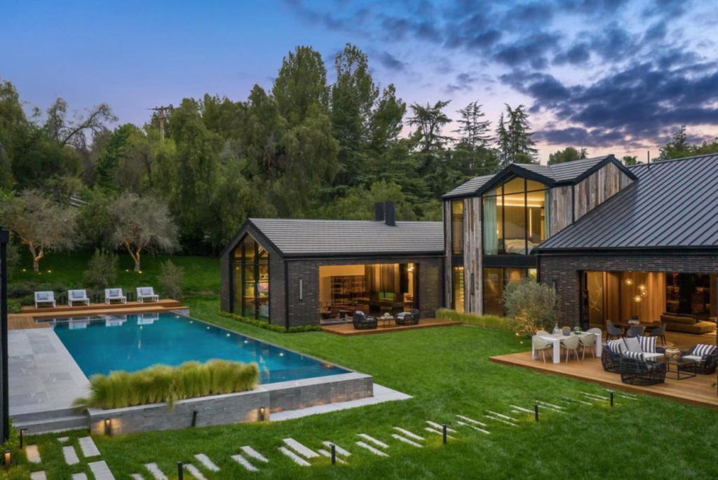 Situated at the end of a quiet cul-de-sac on a 1.5 acre lot, the Simmons estate was built new in 2021 and features a modern farmhouse-style architecture bent, with charcoal-colored brick and reclaimed wood siding. Designed and built by Max Nobel of Nobel LA, the compound includes a main mansion and house-sized guesthouse, plus two separate swimming pools. On a lushly landscaped 1.5 acre lot, the spread weighs in with seven bedrooms and eight baths in about 12,000 square feet of living space.