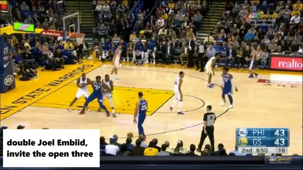 Here’s another example in video form, with the Warriors conceding the open three and doubling Joel Embiid instead: