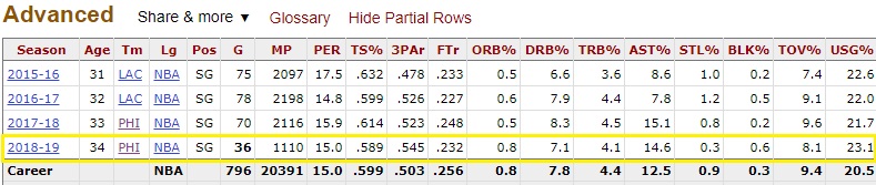 His true shooting percentage (TS%) is currently at a four-year low while his usage rate is at a four-year high, which means he’s seeing more of the ball but doing less with it. That 3PAr stat is “three point attempt ratio,” which means that 54.5% of his shots are three-balls, which is fine. That’s what you’re looking for from him in this offense.