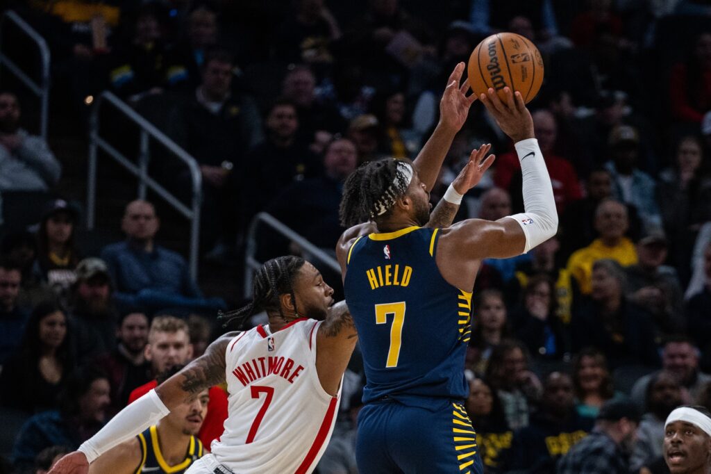 Feb 6, 2024; Indianapolis, Indiana, USA; Indiana Pacers guard Buddy Hield (7) shoots the ball while Houston Rockets forward Cam Whitmore (7) defends in the first half at Gainbridge Fieldhouse. Mandatory Credit: Trevor Ruszkowski-USA TODAY Sports