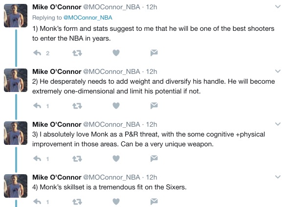 I disagree with none of this. [There’s much more in the thread from O’Connor.] I still think Josh Jackson could ultimately be the better player and that a Jackson-Lowry offseason addition pairing would be the best option. But Monk is the best fit, without question. The biggest thing – the only thing – working against the Sixers drafting him at three is that they would leave better all-around players on the board. Perhaps they shouldn’t overthink this. Absolutely try to trade back a pick or two if they take Monk, but take him either way.