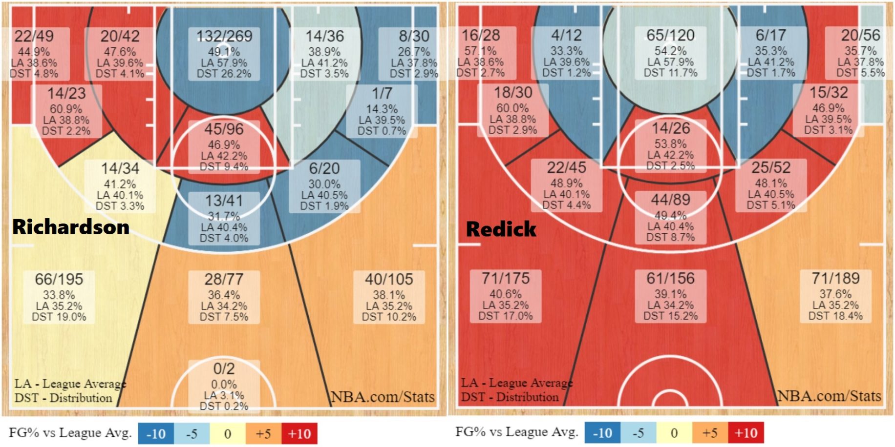 Here’s another comparison between the two, just a juxtaposition of shot charts, with Richardson on the left and Redick on the right: