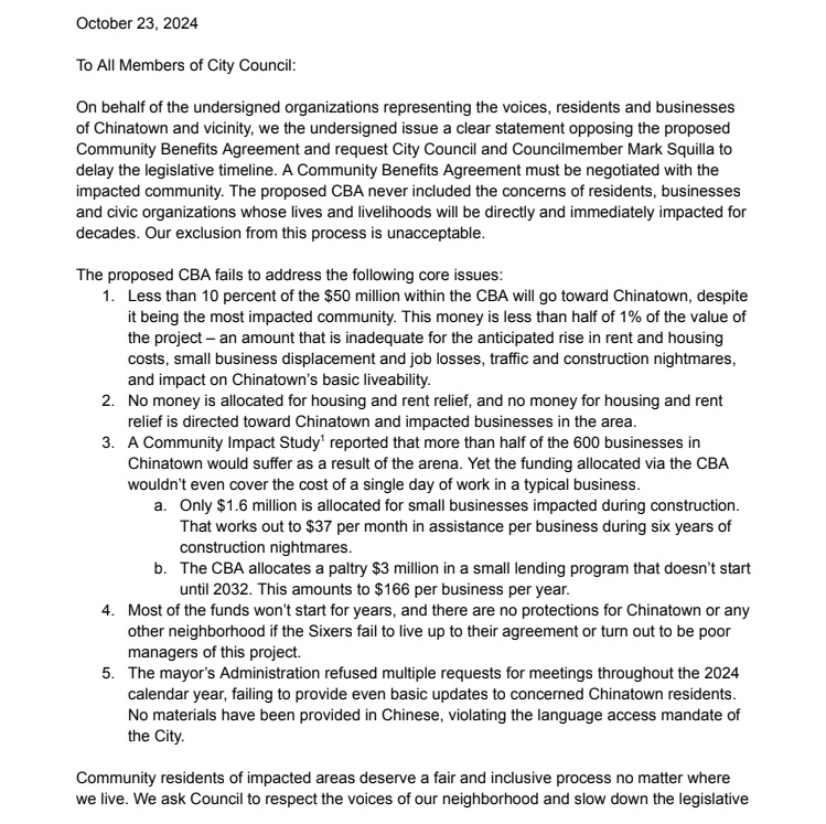 PHILADELPHIA – Today, 102 Philadelphia Chinatown businesses and community organizations sent a letter to City Council opposing the Community Benefits Agreement (CBA) tied to the proposed Sixers arena development. The letter, signed by 102 organizations and businesses, calls for a delay in the legislative process and insists that no project should move forward without the community’s involvement. The letter was sent by Bobby Chang and Alan Chen, Co-Presidents of the Pennsylvania United Chinese Coalition, to all City Councilmembers prior to the October 24 meeting, where arena legislation is expected to be introduced.