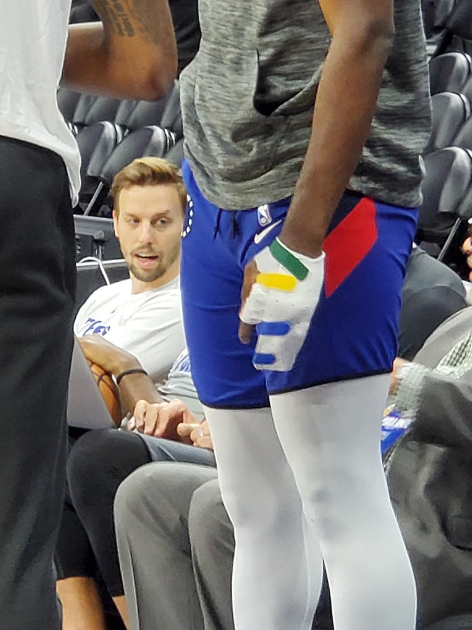Joel Embiid was courtside pregame with a big wrap on his hand. It looked like a soft splint covering the surgically repaired ligament in his finger: