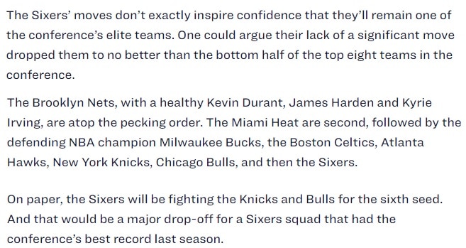 The team re-signed Danny Green and Furkan Korkmaz while adding Andre Drummond and Georges Niang in free agency. They drafted Jaden Springer out of Tennessee and re-signed Rayjon Tucker on a two-way contract. A Ben Simmons trade has not materialized, and so Keith has the Sixers falling off a bit as he looks over the Eastern Conference.
