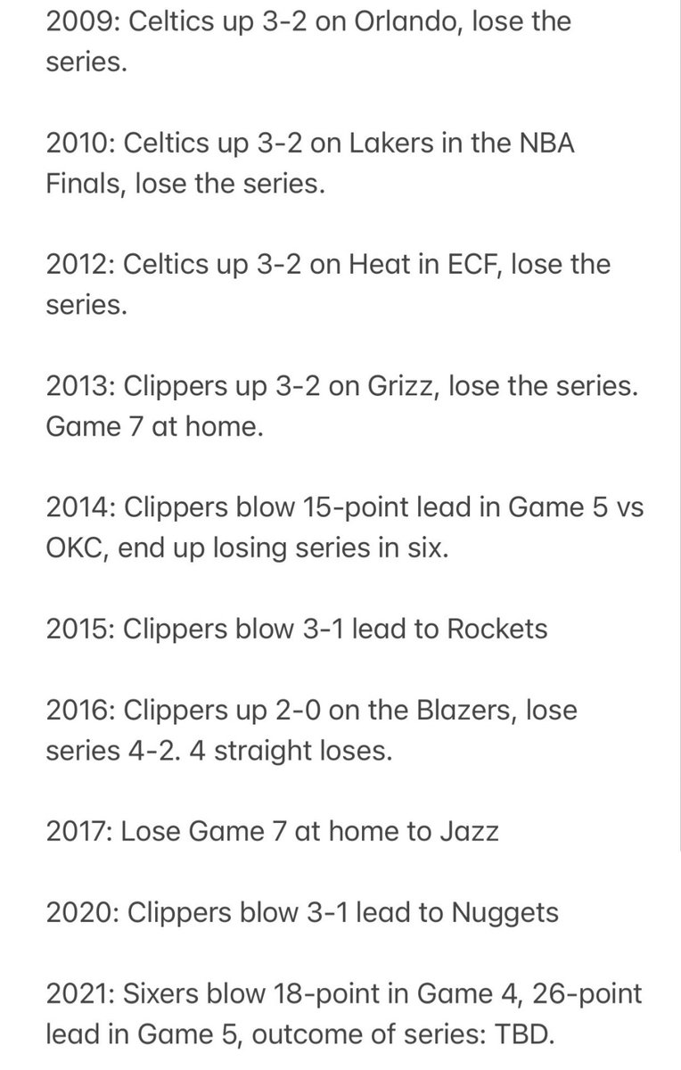 Doc Rivers teams have been eliminated in the playoffs 10 times — 10 — in which they held a series lead (at any point).