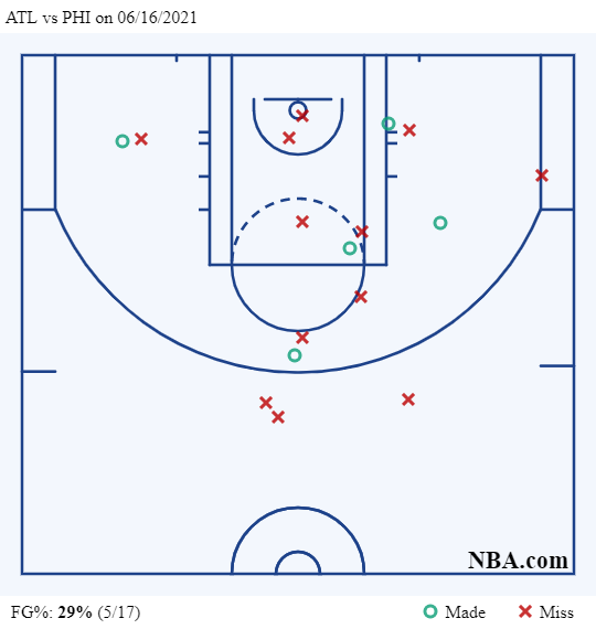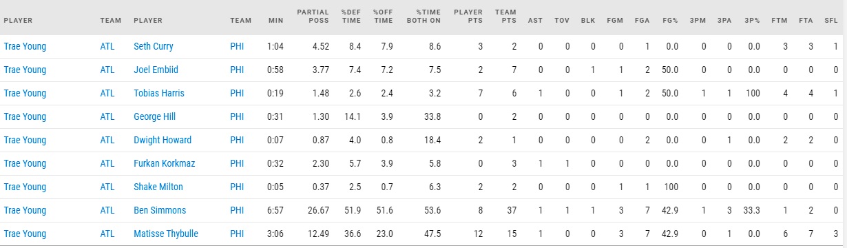 2) Trae Young went for 39 points and absolutely killed the Sixers from the foul line. He shot 6-14 against the Ben Simmons/Matisse Thybulle combo, but the backbreaker was the whistle, and when he was guarded by those two he got to the line nine times, hitting seven of those free throws. He also shot 9-9 from the line on fouls from Seth Curry, Dwight Howard, and Tobias Harris (2x). He finished 17-19 from the stripe.