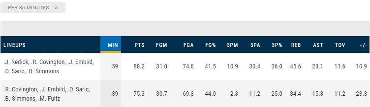 It’s pretty clear that the last year’s starting unit is out-performing this year’s starting unit. All you have to do is watch the beginning of the third quarter to see that, but here’s how the per 36 numbers look when Redick is out there vs. Fultz: