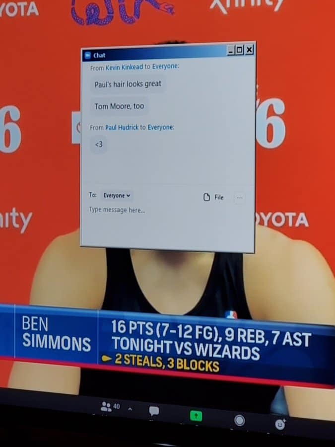 So during the postgame media session with Ben Simmons, the Zoom chat was accidentally broadcast over television, and this is what popped up on your TV screen:
