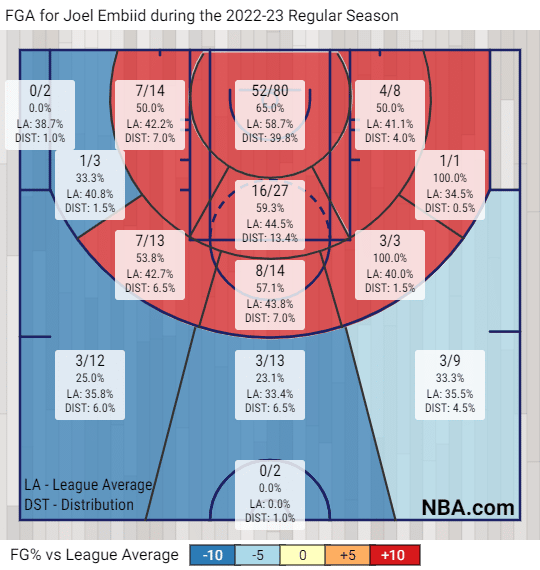 For some context, Joel shot 39.5% and 53.1% from those same two quadrants last year, so even though the sample size is smaller, he’s hitting those bread and butter face-ups mid-range efforts at a higher clip this season. Last night he was 4-5 (80%) in these zones.
