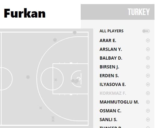 I don’t know why they decided to put gray dots on a gray background, but it’s a very analytics-friendly shot chart. Furkan hit a couple shots off cuts to the rim and tried only one mid-range jumper.