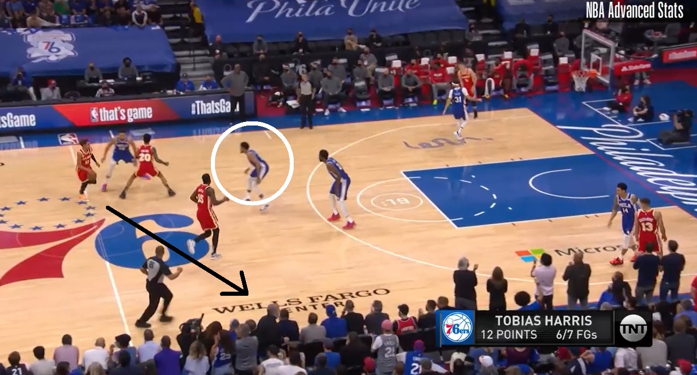 Tobias Harris steps higher, and with Clint Capela just getting into position, it’s harder for Trae Young to get downhill there.