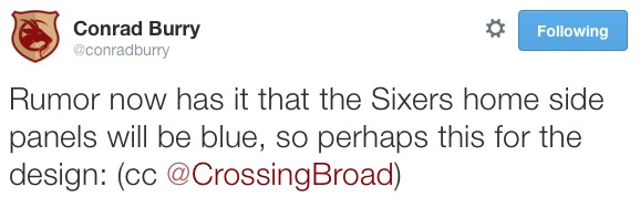 Graphic designer Conrad Burry (@conradburry) updated his Sixers uniform mockup based on a tip a reader sent to us.* Is it accurate? Who knows?! WHO CARES?!?! [I think it is.] But this… this would be a good look.