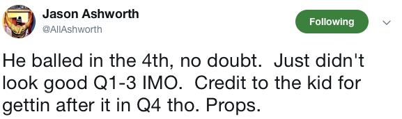 Of course, that almost point-per-minute output and over 50% shooting wasn’t enough for former 97.5-er Jason Ashworth, who wins the First To Make Sweeping and Irrelevant Conclusions About Markelle Fultz’s On-Court Demeanor award™. Here’s Mr. Ashworth, with a special appearance from his podcast co-host0, Ron Burke: