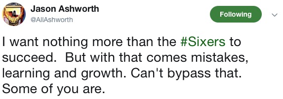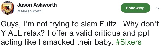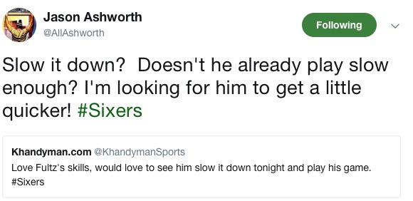 To be honest, I’m kind of shocked that we already got here. I expected concerns over this sort of thing wouldn’t rear their fat, sweaty heads until John Smallwood was assigned a home game or Marcus Hayes needed something to write. But nope, congrats to Jason Ashworth for being the first to boldly take a stance on Fultz’s fluidity. Let’s revisit this sometime this season.