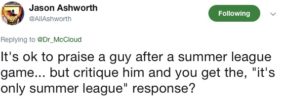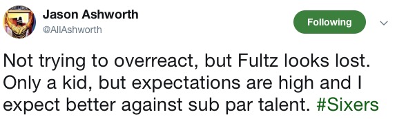 Not trying to overreact…. but Fultz looks lost in his 40th professional minute at age 19 in his second competitive game in four months. I’m not sure what was more ridiculous– that, or the straw man argument about fans “bypassing” learning and growth. Somehow, calling someone out for a dumb hot take about Fultz’s calm approach was misconstrued into fans planning the parade next summer.