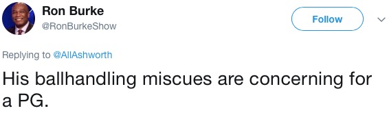 Of course, that almost point-per-minute output and over 50% shooting wasn’t enough for former 97.5-er Jason Ashworth, who wins the First To Make Sweeping and Irrelevant Conclusions About Markelle Fultz’s On-Court Demeanor award™. Here’s Mr. Ashworth, with a special appearance from his podcast co-host0, Ron Burke: