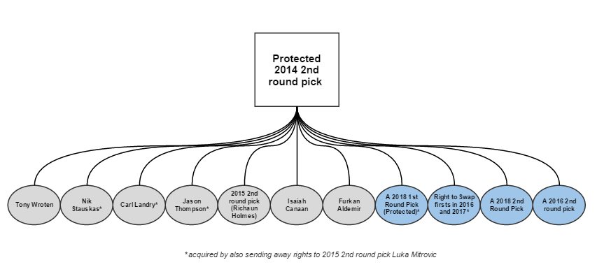 In 2014, Sam Hinkie’s way of taking on salary dumps and making the Sixers available as the third team in three-team deals was the “protected second round pick.” And boy was it protected. The teams “receiving” the pick in these deals had no illusions that they’d actually get it (and if they did, it was just a plus). They just needed to dump some salary or a player in a deal with a trade exemption and the Sixers needed to toss something out there in return. So let’s look at what Sam Hinkie did with a protected 2014 second round pick. [Ed. Note: All of these deals MIGHT be for the same pick. They probably are. That is, however, unconfirmed at this point.]: