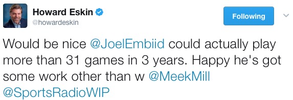 At this point, Eskin has become such a sour fossil that time since he had any relevance could be measured in half-life. Through this dark, burnt crisp of a local sports landscape, Eskin somehow manages to find the negative in a (funny!) 30-second spot a local athlete partook in. Sometimes I think he rips the Sixers just to piss off Spike.