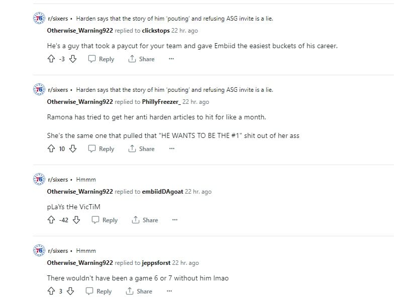 Shout out to CB reader Rob, who found what could be some sort of James Harden-adjacent burner account, or dude’s biggest sycophantic fan. Rob notes that a “random person started a Reddit account on May 23, 2023 – 9 days after the Sixers were eliminated from the playoffs.” The account name is “Otherwise_Warning922,” no profile photo obviously, and they do all of their posting in r/NBA and r/Sixers. There are a LOT of posts, but the vast majority are about James Harden, typically going to great lengths to defend him.