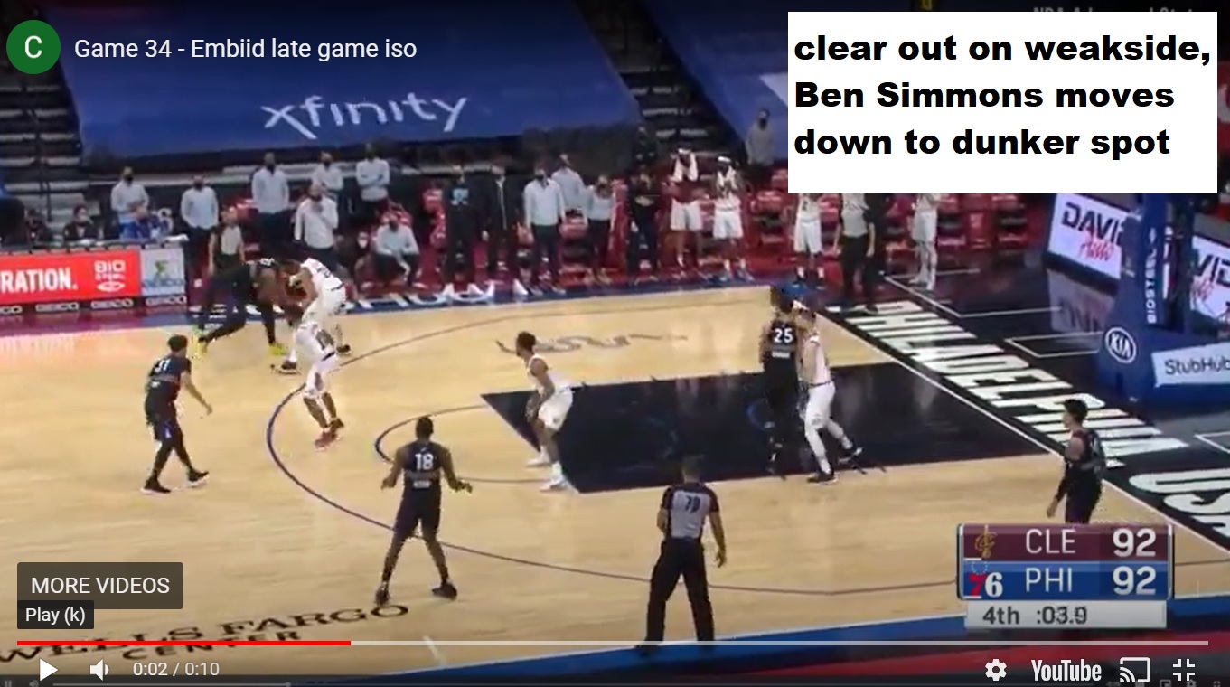 Since Ben Simmons is not a shooter, you move him down to the dunker spot and fan out the other three guys. That’s pretty much the way you have to do it if you want to give Embiid that space on the left to attack Allen off the dribble.
