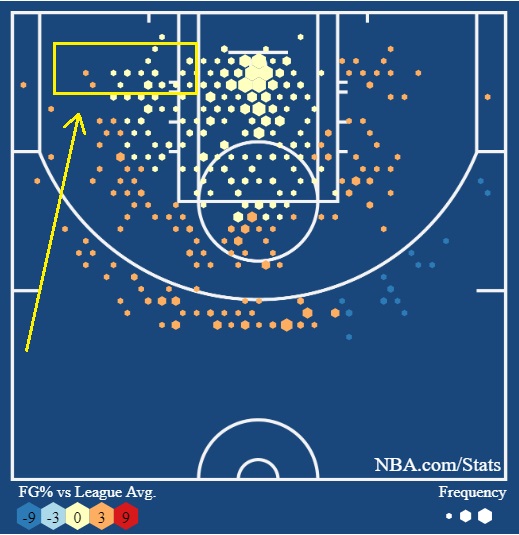 Embiid is pretty much right at the league average from the left baseline. The majority of his face ups and anything in the 10-14 foot range takes place on that side of the floor, too, and you can see how much more frequently he shoots from that side.