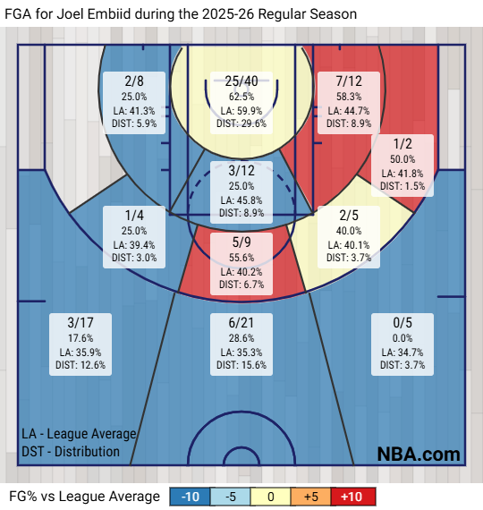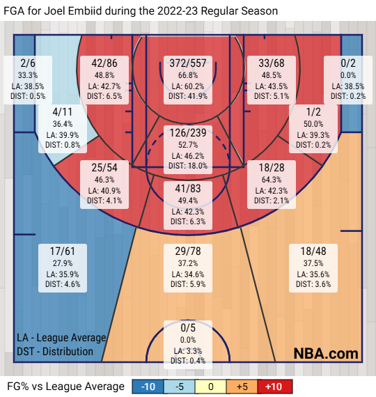 However you slice it, Embiid’s shooting splits are underwhelming across the board. This year he’s below league average from three, above league average in some mid-range quadrants on the right, and then sitting right around league average at the rim: