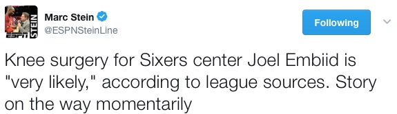 January practice, eh? When Bryan Colangelo was forced to acknowledge the meniscus tear on February 11, he said it could’ve been a pre-existing condition. Most fans assumed it happened when Embiid torqued the ever-living shit out of his knee against the Trailblazers. But Stein, if he’s correct, asserts that it happened during a January practice. Makes you go hmmmmmmmmmmm.