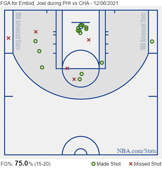 Perhaps the biggest takeaway is that Joel got back to being himself. He only fired two three pointers and did a lot of work in the paint, resulting in a final shot plot looking like this: