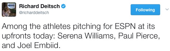 This morning, ESPN is pitching their new agenda personality-driven programming, which was just announced to include a Bomani Jones and Pablo Torre hour (yuck), and presumably their super premium NBA and NFL broadcasts. Including Embiid alongside Serena Williams and the recently-retired Paul Pierce says a lot about the marketing potential of Embiid. Obviously, ESPN took notice of his star power and thinks he will serve as an excellent pitchman to big brands.
