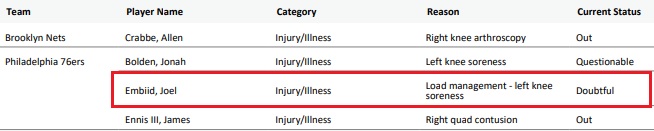 Joel Embiid is Listed as DOUBTFUL For Game One