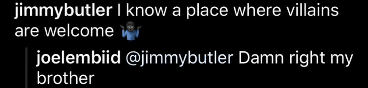 Perhaps to soften the blow, he included “#TheProcess” and make the location “All Love”. But still, this isn’t the kind of thing that’ll endear himself to fans who openly complained about shushing the Wells Fargo Center faithful, including telling someone -he said himself- to “shut the f*** up.” To make matters worse (?) former Sixer and friend of Embiid, Jimmy Butler responded to the post leading to this exchange: