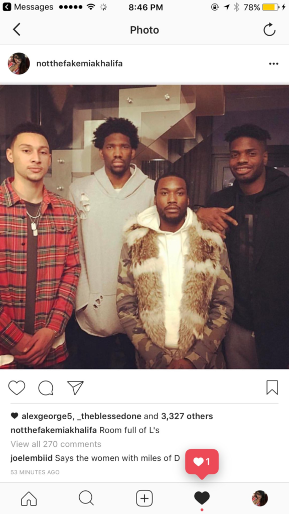 I got up at 3 a.m. with my teething son, and here I am blogging about Joel Embiid giving Mia Khalifa the ol’ Cameroonian Comment Thread after she dared to comment on a picture he posted with Ben Simmons, Nerlens Noel and Meek Mill. Career day should be fun.