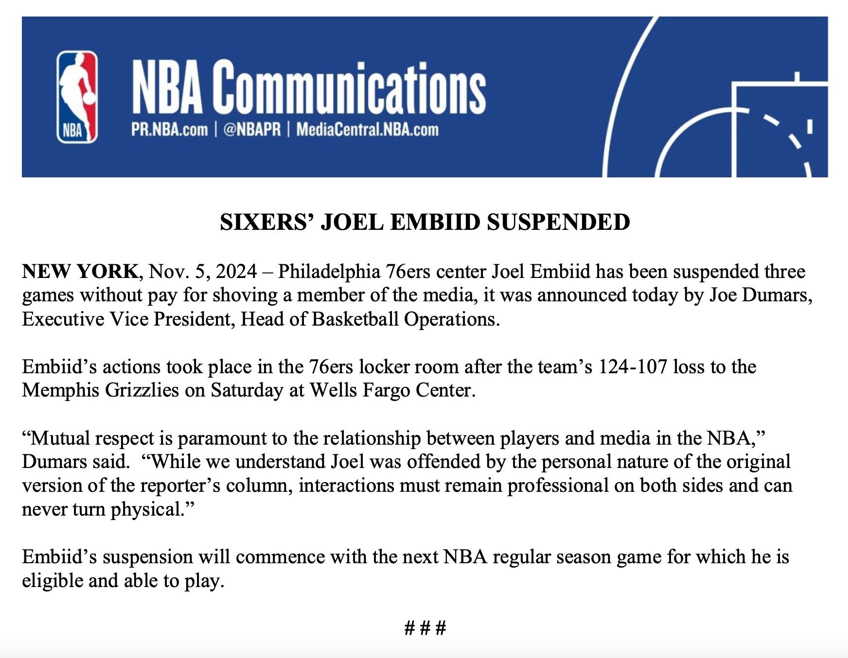 Joel Embiid suspended three games by the NBA: