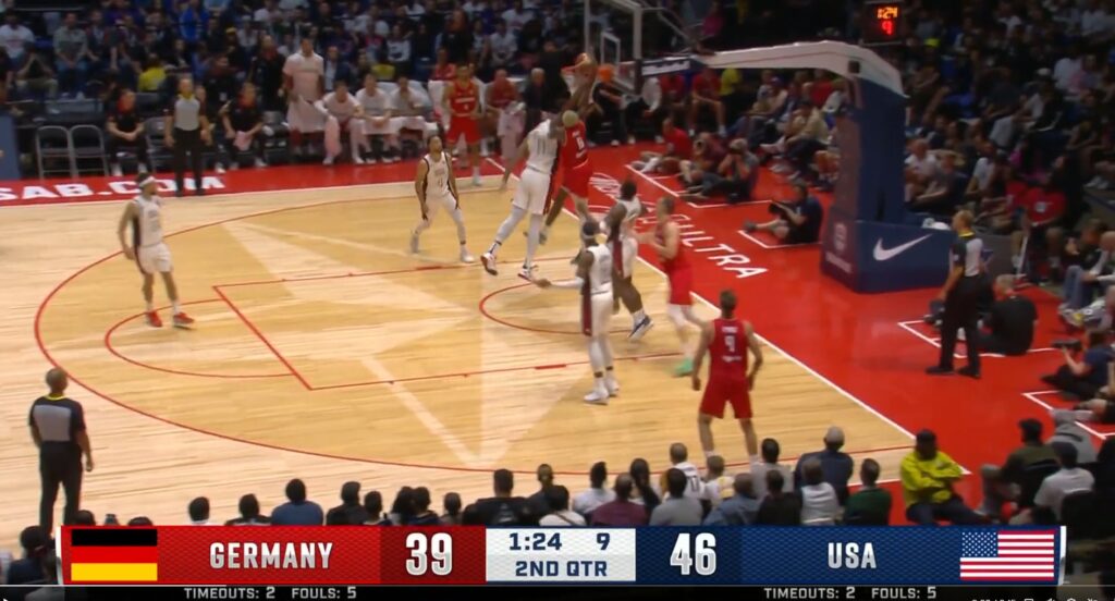 Embiid looks better. Knocking the rust off and getting used to FIBA play. He had a really nice outlet pass for a LeBron dunk earlier, and he was effective in the first half against a front court that features a couple of NBA players. Germany has Daniel Theis, Mo Wagner, Franz Wagner, Dennis Schroder, and a bunch of good Europe-based players, like Andreas Obst, who lets fly like 2018 Marco Belinelli.