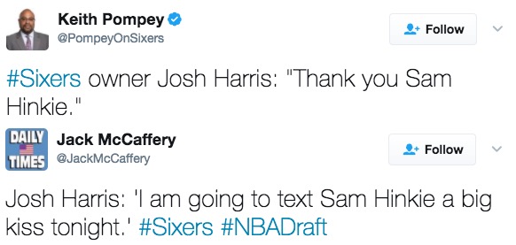Harris can’t have Hinkie. Scott O’Neil can’t have “the process.” It wasn’t until 20k maniacs chanted about it at the Wells Fargo Center this year that O’Neil and his crew embraced it. And despite never publicly criticizing him, it wasn’t until last night that Harris dared to credit Hinkie for putting the Sixers in the position they’re in. Don’t pander to the fans. Let us have our Hinkie adoration. You forced him out and have to live with the alternative. Is Bryan Colangelo the right guy to mold the Sixers into a winner? Who knows. I certainly would have more confidence in Hinkie to do so (for example, to hold Josh Jackson hostage on draft night and trade back two picks to take Malik Monk), but it remains to be seen what Colangelo is truly capable of.