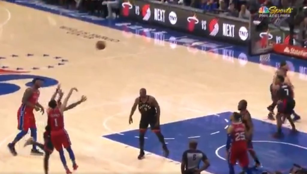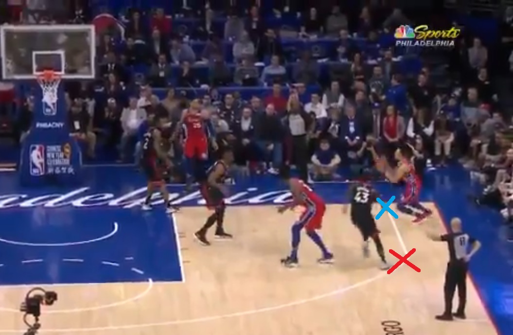 Shamet, curling off a Joel Embiid hip/butt screen, was called for a leg kick here: