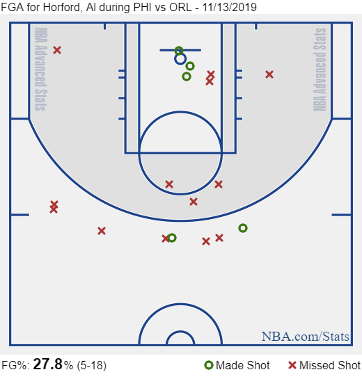 As for Horford, a 5-18 night is disappointing considering that he rested on Tuesday. He had a difficult task against a fairly large Magic team, a club with good bigs, but even when Horford came outside of the paint he wasn’t hitting, putting up a shot chart that looked like this: