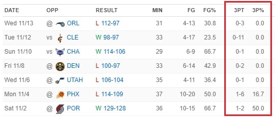 Harris is actually 0-18 from three over his last five games, last hitting 10 days ago in Phoenix. Here, see for yourself: