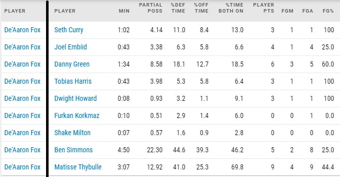 That’s pretty good. Fox shot a combined 6-17 against the combo of Simmons and Thybulle. If you go through his 30 field goal attempts on the evening, he missed nine of his last ten.