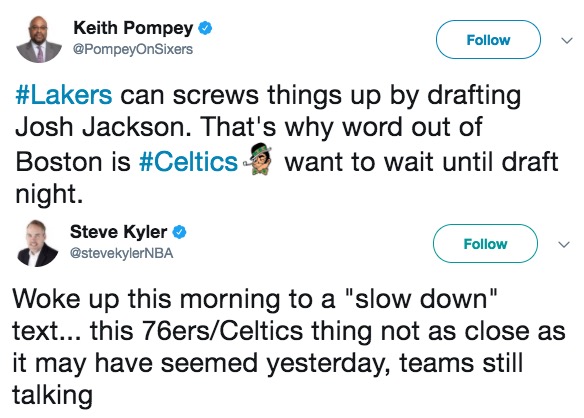 Just when you thought things were beginning to turn around as a Sixers fan, a slew of reports and conjecture was shatted into our timelines this morning. As it stands now, the Sixers and Celtics seem to have a loose agreement for some assortmant of picks to go to the Celtics in exchange for their number one pick. But the Celtics, it would seem, are willing to move back to three only because they like Josh Jackson and feel they could get him there.