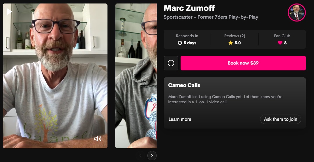 Marc Zumoff recently retired after 39 years of covering Sixers basketball, the vast majority from the play-by-play chair. He’s pursuing other endeavors these days and jumped on Cameo to offer his services to you, the fan.