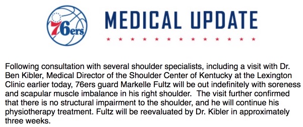 A team source confirms that Fultz has now seen three specialists, all of whom have concluded that there’s no structural damage. From the sounds of it, Fultz should be eligible to return sometime after three weeks, presumably once he’s brought back up to speed and has time to practice with the team after his follow-up visit. I would also imagine that sitting Fultz has a lot to do with his mental state as well. Playing through an injury while limited as an established player is one thing, doing so as a rookie is another. It does no one any good to for Fultz to have his confidence further eroded playing with an injury.